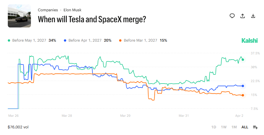 Wedbush's Dan Ives is betting on the latter, pointing to a joint chip factory in Austin, a pending SpaceX IPO targeting a $1.75T valuation, and operational ties that are tightening fast. Markets are giving it about a 1-in-5 shot by this time next year.